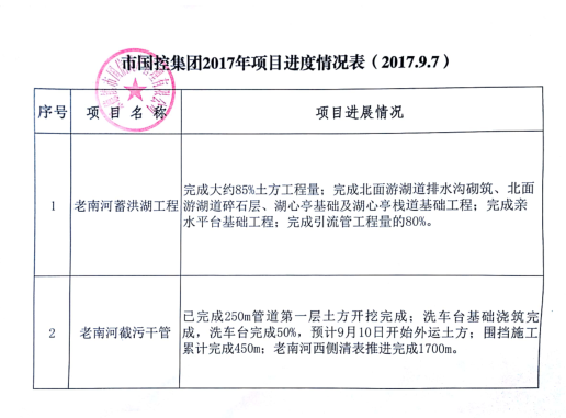 截止目前,工作进展情况:①市珠山区政府负责征地拆迁工作:按市政府要求,5月份完成红线拓宽修改工作(约50米-100米),8月底基本完成拆迁工作,下步将进行征地工作。②由市国控集团负责老南河蓄洪湖一期项目建设:该工程已于2017年2月15日开工建设;截止目前,完成了土方工程量约85%和引流管工程量约80%;完成了北面游湖道排水沟砌筑、北面游湖道碎石层、湖心亭及湖心亭栈道、亲水平台等基础工程,现正在对观景平台基础开挖整形及垫层混凝土浇筑。③中铁四局负责老南河截污干管建设工程:总长约2.6公里,该工程已于8月中旬开工建设;截止目前,完成清表1.5公里,完成干管土方250米,完成围墙500米,洗车池1个。