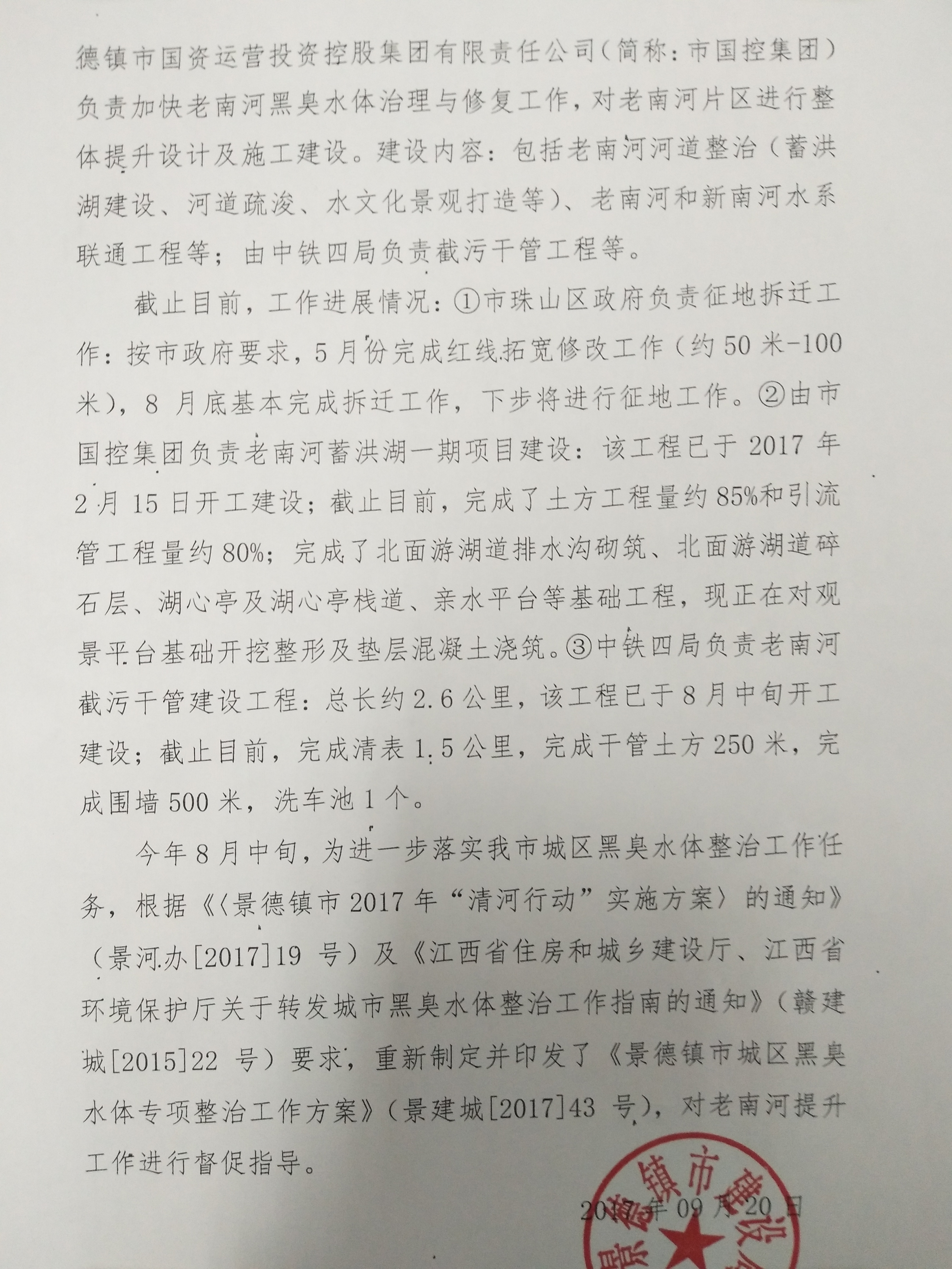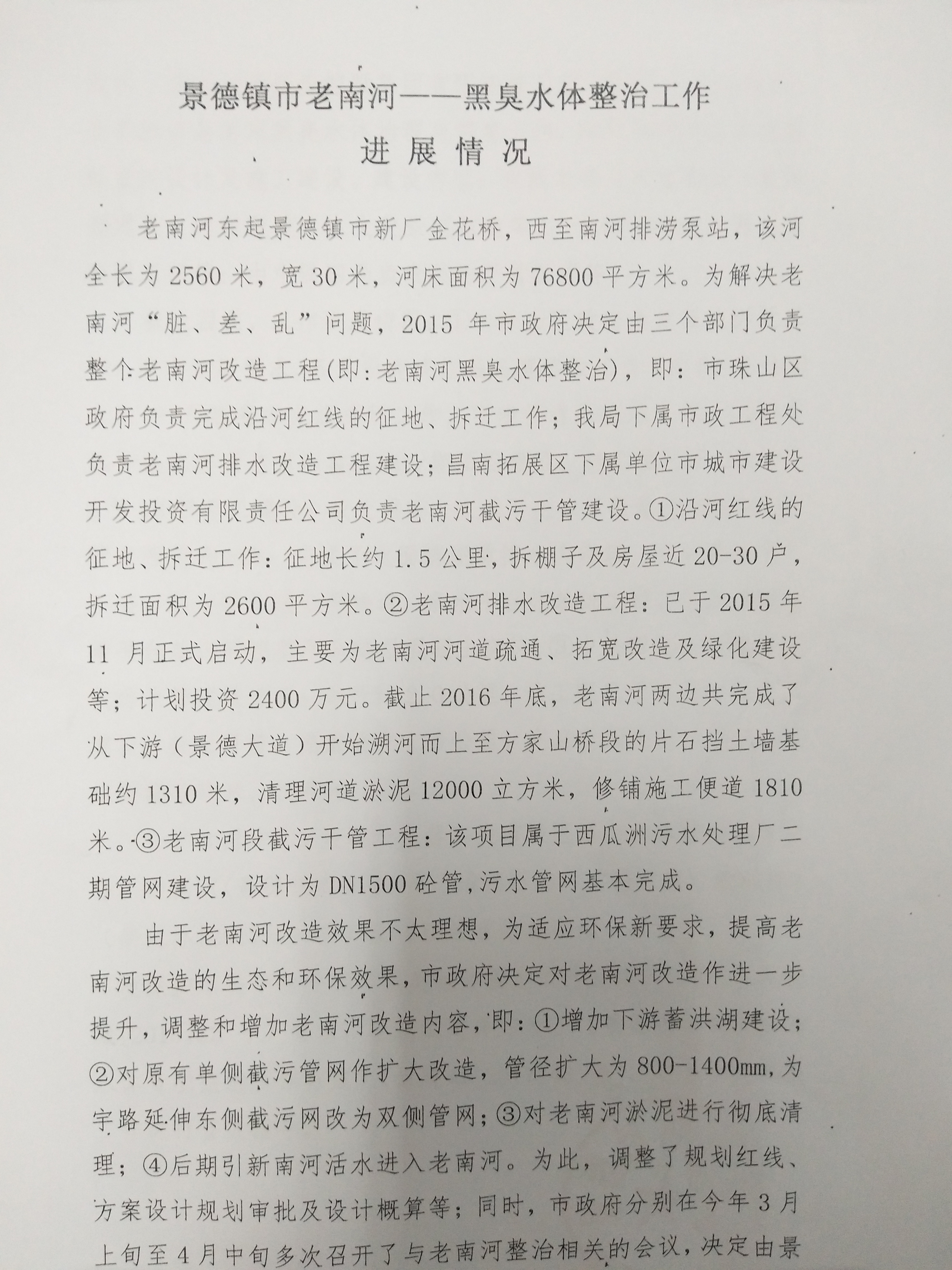 今年8月中旬,为进一步落实我市城区黑臭水体整治工作任务,根据《〈景德镇市2017年“清河行动”实施方案〉的通知》(景河办[2017]19号)及《江西省住房和城乡建设厅、江西省环境保护厅关于转发城市黑臭水体整治工作指南的通知》(赣建城[2015]22号)要求,重新制定并印发了《景德镇市城区黑臭水体专项整治工作方案》(景建城[2017]43号),对老南河提升工作进行督促指导。