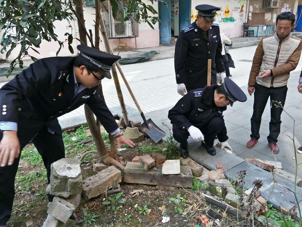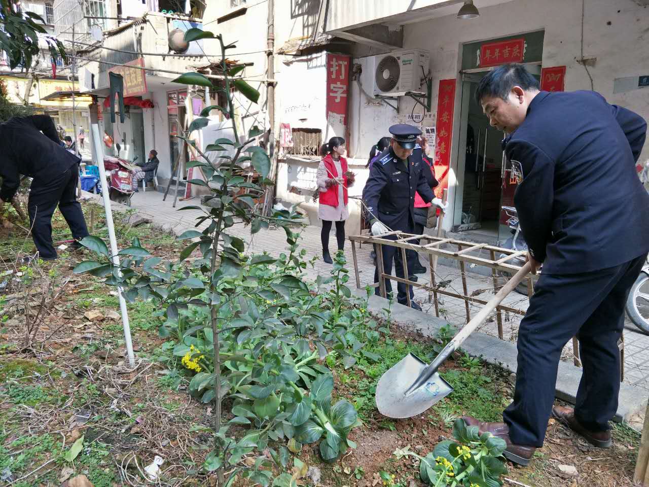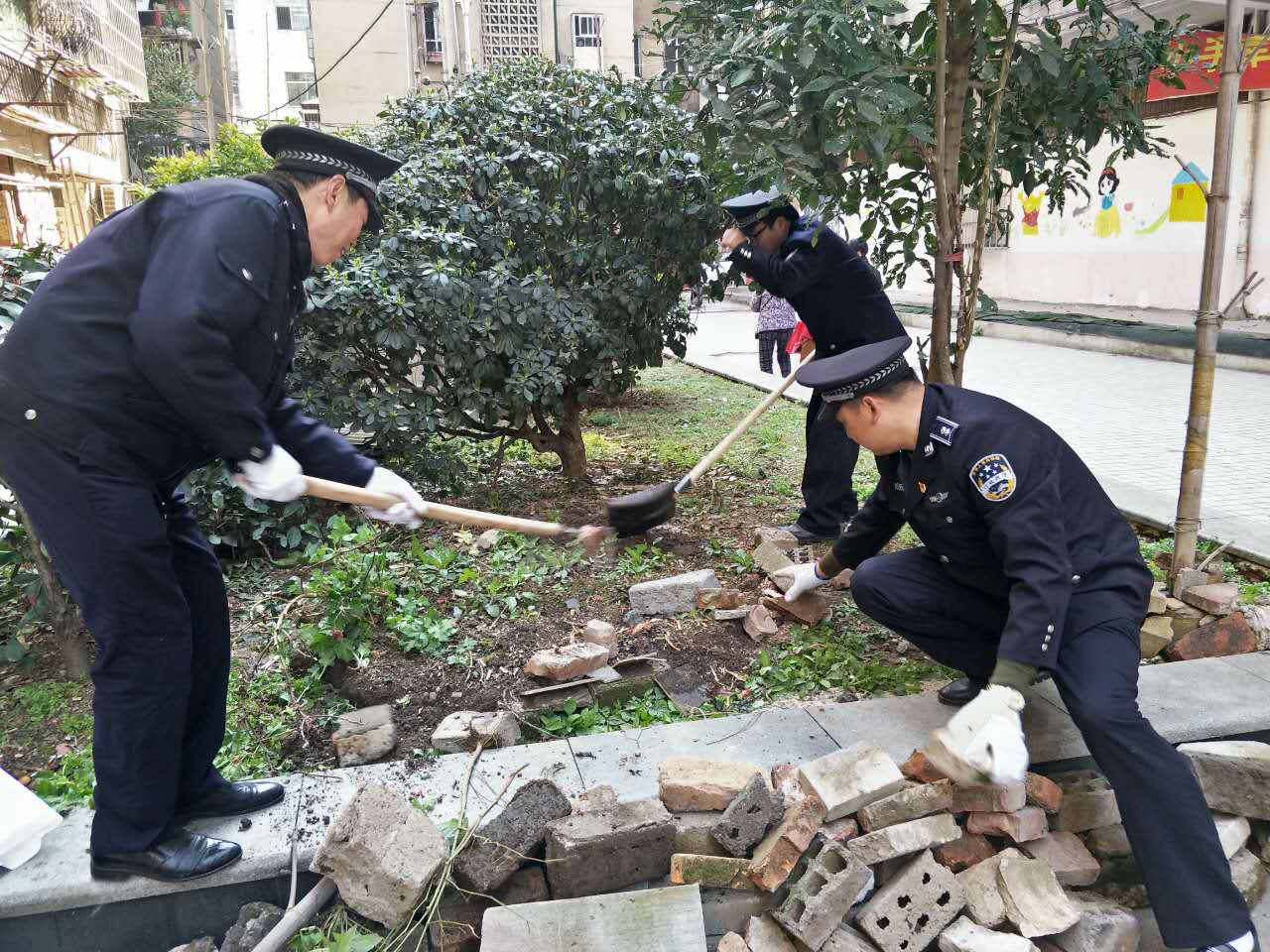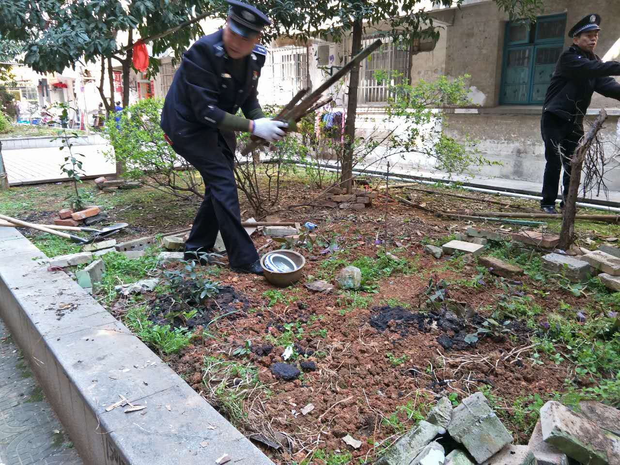 (如图:执法人员正在朝阳路两侧绿化岛内清除菜地及杂物)